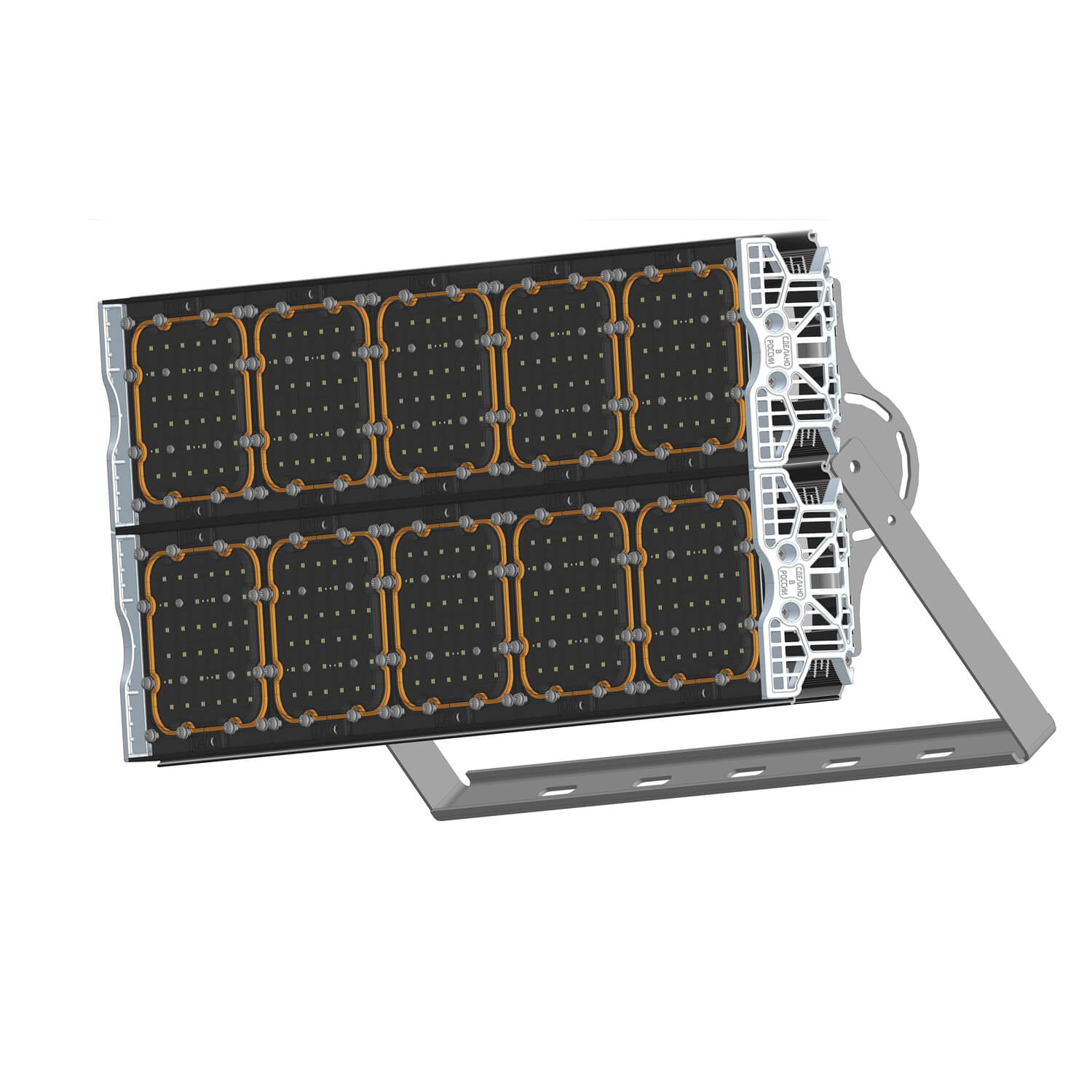 Прожектор светодиодный осветительный, представляющий собой группу светоизлучающих модулей, установленных на осветительной мачте, подключенных к одному выносному модулю питания.